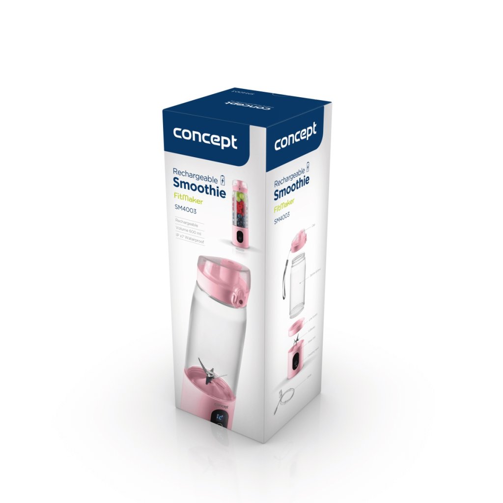 Smoothie FitMaker Concept SM4003 je pro každého, kdo žije aktivním životním stylem a touží si snadno a rychle připravit zdravé smoothie kdykoliv a kdekoliv. Disponuje integrovanou Li-Ion baterií, takže nejste závislí na přítomnosti zásuvky. Díky svému kompaktnímu a lehkému zpracování se pohodlně vejde do batohu nebo kabelky a vy si ho tak můžete vzít kamkoliv s sebou – na výlet, do práce nebo na cvičení.